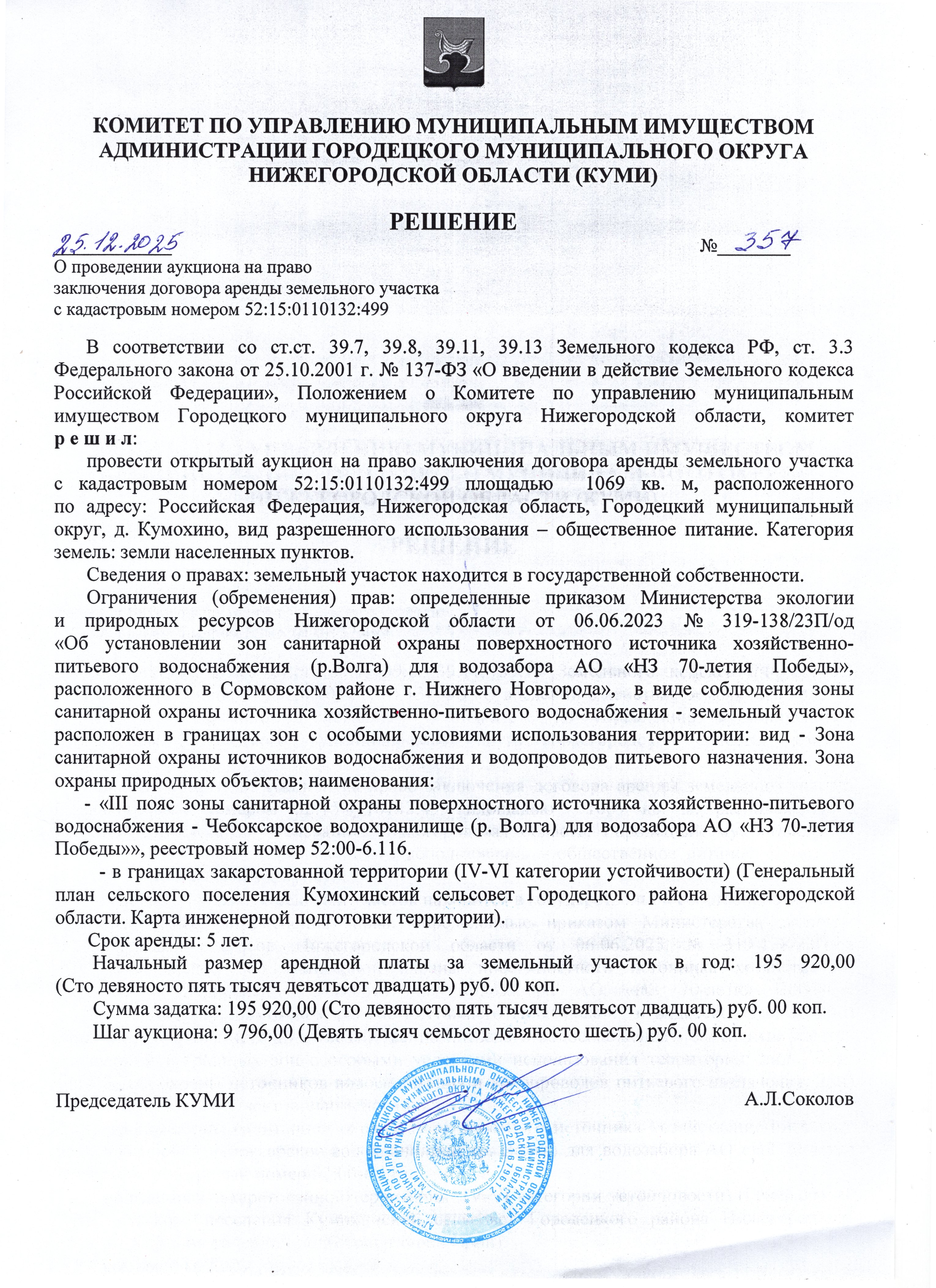 Извещение о проведении «25» февраля 2026 года в 10 часов 00 минут аукциона в электронной форме на право заключения договора аренды земельного участка на электронной торговой площадке http://utp.sberbank-ast.ru в сети «Интернет»